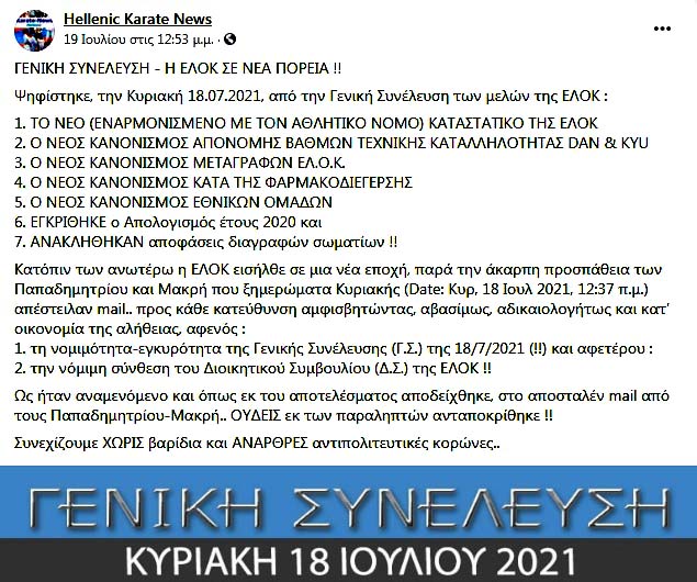 Παρά την αγανακτισμένη παραίτηση Σιταρά το ΔΣ/ΕΛΟΚ δεν απάντησε με καμιά του κίνηση παρά μόνο με τη δημοσίευση της επόμενης ανάρτησης bullying, που βρωμάει Δρακόπουλο, στο λογαριασμό του Ηλία Χρήστου Hellenic Karate News στο Facebook! Με λύπη βλέπει κανείς ότι κανένας δεν προβληματίζεται για την κατάσταση, ώστε να ζητήσει εξηγήσεις για τις αιτιάσεις του εξώδικου, και αυτό συμβαίνει διότι κανένας δεν καταλαβαίνει την κατάσταση! Σε ένα δικαστήριο, όμως δεν θα γίνει το ίδιο!