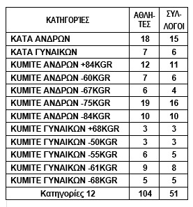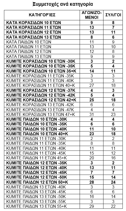 Στον ανωτέρω πίνακα φαίνονται οι συμμετοχές ανά κατηγορία. Ο πίνακας αυτός μας δείχνει τις αδύνατες κατηγορίες με κάτω από 6 αθλητές ή όποιο άλλο όριο κρίνεται πιο κατάλληλο! Αυτές είναι περί τις 14-16 και θεωρούνται πολλές! Ποτέ δεν έχω δει στην ΕΛΟΚ να γίνονται τέτοιες και πιο λεπτομερείς μελέτες και να διοχετεύονται στους συλλόγους για μια εκτεταμένη στρατηγικά ανάπτυξη! Αλλά αυτοί έχουν το μυαλό τους στην εξουσία! Το λίγο μυαλό, βέβαια, για όσους το κεφάλι τους δεν είναι ... τελείως ακατοίκητο!