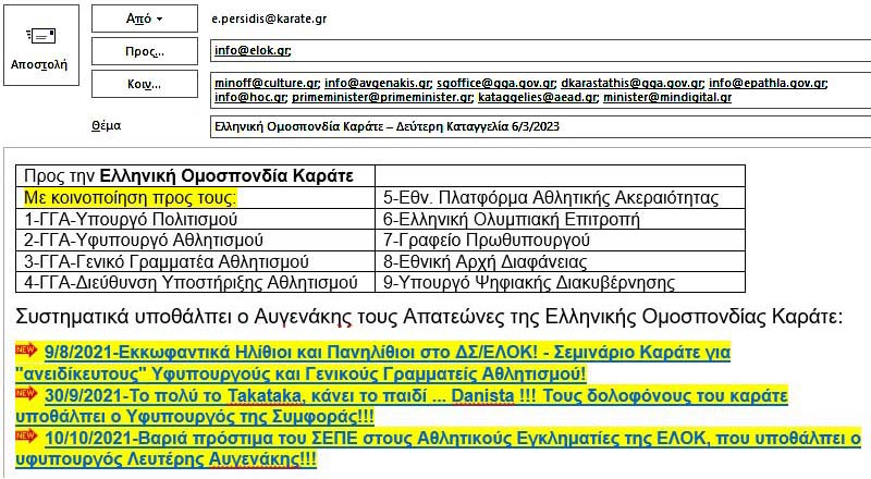 Όλα αυτά, όμως, καταγγέλονται δημόσια με τις δημοσιεύσεις και τις αναρτήσεις στο διαδίκτυο του www.karate.gr, ώστε ο Υφυπουργός Λευτέρης Αυγενάκης όσο και να θέλει να κρύψει τις παρανομίες των προστατευομένων του δεν μπορεί να ισχυριστεί ότι "δεν έπεσαν στην αντίληψή του" και τόσο περισσότερο γίνεται συνένοχος και συνεργάτης στις παρανομίες τους!