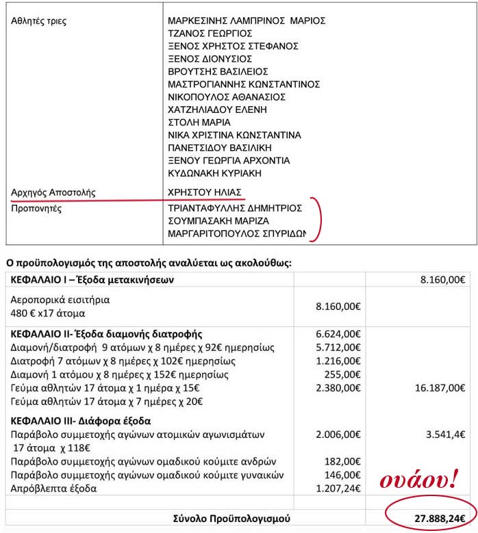 Αρχηγός αποστολής ο Ηλίας Χρήστου λόγω της προσωπικής γνωριμίας με τον Πρόεδρο Αντόνιο Εσπίνος (?)! Αλλά ο Εσπίνος αυτή τη φορά τον περιφρόνησε! Ούτε μια φωτογραφία δεν του ... αφιέρωσε! Μόνο μία έβγαλε ο Ηλίας με τον γραμματέα της Παγκόσμιας Toshihisa Nagura σε κάποιο διάδρομο του ξενοδοχείου, που τον πέτυχε, για να δικαιολογήσει το "Αρχηγός Αποστολής"!!! Η ΓΓΑ ζητάει συμβάσεις των προπονητών με τα σωματεία! Η ίδια έλεγξε αν έχουν συμβάσεις οι τρεις προπονητές με την ομοσπονδία, που επιχορηγεί? Τέλος, 28.000 ευρόπουλα? Δικαολογούνται τα λεφτά από τα αποτελέσματα ή ήταν τουριστικό το ταξίδι, κύριε Καραστάθη???