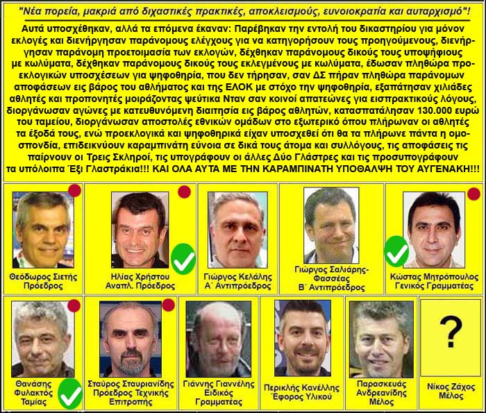 Αυτά και άλλα παρόμοια σας κυνηγάνε με την αγωγή ακύρωσης των εκλογών σας και ακόμα δεν τελειώσατε! Όπως σχετικά με τους Παρασκευά Ανδρεανίδη και Ηλία Χρήστου, διότι από τον ίδιο σύλλογο και οι δύο και ο πρώτος μέλος του ΔΣ/ΠΟΠΚ! Τους Σιετή-Κελάλη και Σαλιάρη-Φατσέα, διότι από τον ίδιο σύλλογο και οι δύο, τους Φυλακτό και Γιαννέλη, διότι από τον ίδιο σύλλογο και οι δύο, τον Κανέλλη, διότι ο πατέρας του υπάλληλος της ΕΛΟΚ, και τον Σταυριανίδη, διότι μόνιμος προπονητής!!!