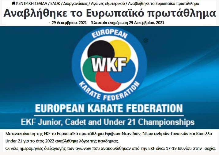 Αναβλήθηκαν οι Πανευρωπαϊκοί της WKF λόγω Covid, όπως ανακοίνωσε η ΕΛΟΚ. Αυτό σημαίνει ότι οι αγώνες της WKF, όπως και αν γίνονταν κατά τη διάρκεια της πανδημίας, από απόψεως επιπέδου συμμετοχών και ποιότητας δεν ανταποκρίνονταν στις προσδοκίες των χωρών, των αθλητών των θεατών, αλλά και της ίδιας της διοίκησης της WKF!