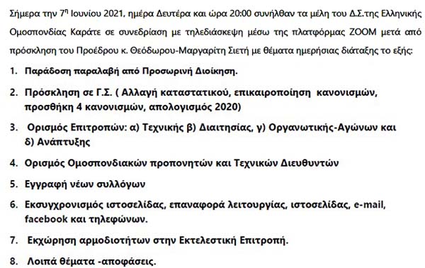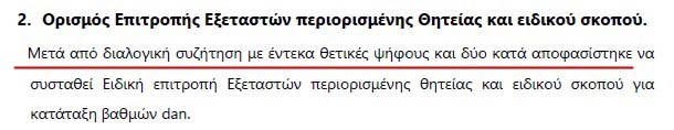 Ενώ η απόφαση του ΔΣ της 24/6/2021 είναι απόλυτα χωρίς καμιά συζήτηση, λητή και αόριστη (ποιοί θα είναι στην Επιτροπή, γιατί γίνεται τώρα η απονομή Νταν, γιατί παρανομούν έναντι του υπάρχοντος Εσωτερικού Κανονισμού, που ενεκρίθει από τη ΓΓΑ την 13/12/2017, με τι εξετάσεις θα γίνει η κατάταξη, ποιοί θα είναι οι εξεταστές, και άλλα), η ανακοίνωση που ακολούθησε την επόμενη ημέρα 25/6/2021 (η ευτυχία του ... δικτάτορα, που κάνει ότι θέλει, όποτε θέλει!), και μάλιστα παράνομα πριν αναρτηθεί η απόφαση στη ΔΙΑΥΓΕΙΑ, ήταν καθοριστικά η επόμενη με σημειωμένα τα καραμπινάτα παράνομα σημεία της: