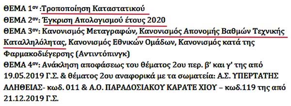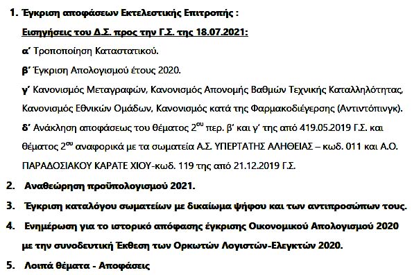 Περιλαμβάνονται Θέματα για την Αναθεώρηση του Προϋπολογισμού του 2021, Έγκριση Σωματείων με δικαίωμα ψήφου, Έγκριση Οικονομικού Απολογισμού 2020 και Έκθεση των Ορκωτών Λογιστών για αυτόν καθώς και η παράνομη τσόντα: Λοιπά Θέματα - Αποφάσεις σε ευθεία ειρωνεία και υφαρπαγή ψήφου της μειοψηφίας και των συλλόγων!