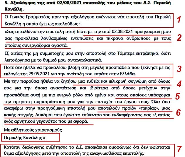 2 - Την 2-8-2021 ο Περικλής Κανέλλης έγραψε την Πρώτη Επιστολή-Καταγγγελία για τη στρεβλή λειτουργία του ΔΣ/ΕΛΟΚ και την 2-9-2021 (σε 30 ημέρες του Αυγούστου, που δεν δούλευε τίποτα!) την αποκήρυξε, δηλώνοντας μετανοημένος, διότι "προκάλεσε λανθασμένες εντυπώσεις και πίκρανε ανθρώπους"! (Εδώ ακούγεται background ... το κλάμα της Μάρθας Βούρτση!) Την λέξη "αγαστά" δεν την ξέρει ο Περικλής Κανέλλης ούτε κανένας άλλος μέσα στην ΕΛΟΚ! Ούτε εγώ την ξέρω και δεν την χρησιμοποιώ, διότι χρησιμοποιώ λέξεις, που καταλαβαίνουν όλοι! Την ξέρει και την χρησιμοποιεί κάποιος που κάνει φιγούρα με το λεξιλόγιό του και ξέρουμε ποιός είναι αυτός!!!