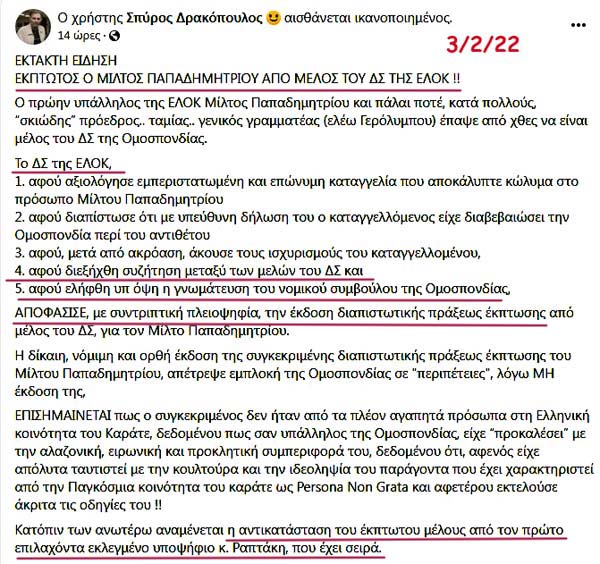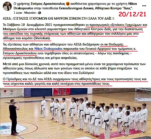 Ο Αρχηγός (!) του τμήματος καράτε των Εκπαιδευτηρίων Δούκα Σπύρος Δρακόπουλος δημοσίευσε την 20/12/2021 την επόμενη ανάρτηση στο λογαριασμό του στο Facebook!