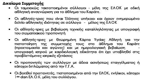Δεν αναφέρονται πουθενά στιλ και Νταν! Παραπέμπει, επίσης, η Προκήρυξη στους Κανονισμούς Αγώνων της ΕΛΟΚ, που είναι ίδιοι με τους Κανονισμούς Αγώνων της WKF, οι οποίοι επίσης δεν αναφέρουν πουθενά στιλ και Νταν!!!