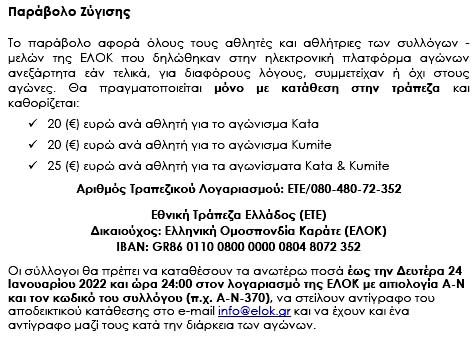 Στον ανωτέρω πίνακα αγώνων, οι σημειωμένοι με πράσινο είναι οι νόμιμοι θεσμικοί αγώνες της ΕΛΟΚ, τους οποίους διενεργεί με την άδεια αναγνώρισης, που της έδωσε το 1990 η Πολιτεία, ενώ οι σημειωμένοι με μπλε είναι οι νόμιμοι αγώνες των υπερκείμενων ομοσπονδιών του εξωτερικού, στις οποίες είναι μέλος η ΕΛΟΚ και παίρνει μέρος στους αγώνες τους! Τέλος, με κόκκινο είναι σημειωμένοι οι αγώνες-μαϊμού της ΕΛΟΚ με διάφορες ονομασίες για να γεμίζει το Ταμείο της, διότι έγχρωμες και μαύρες ζώνες ΔΕΝ ΕΧΕΙ, ενώ το Open Series είναι αέρας κοπανιστός!!!