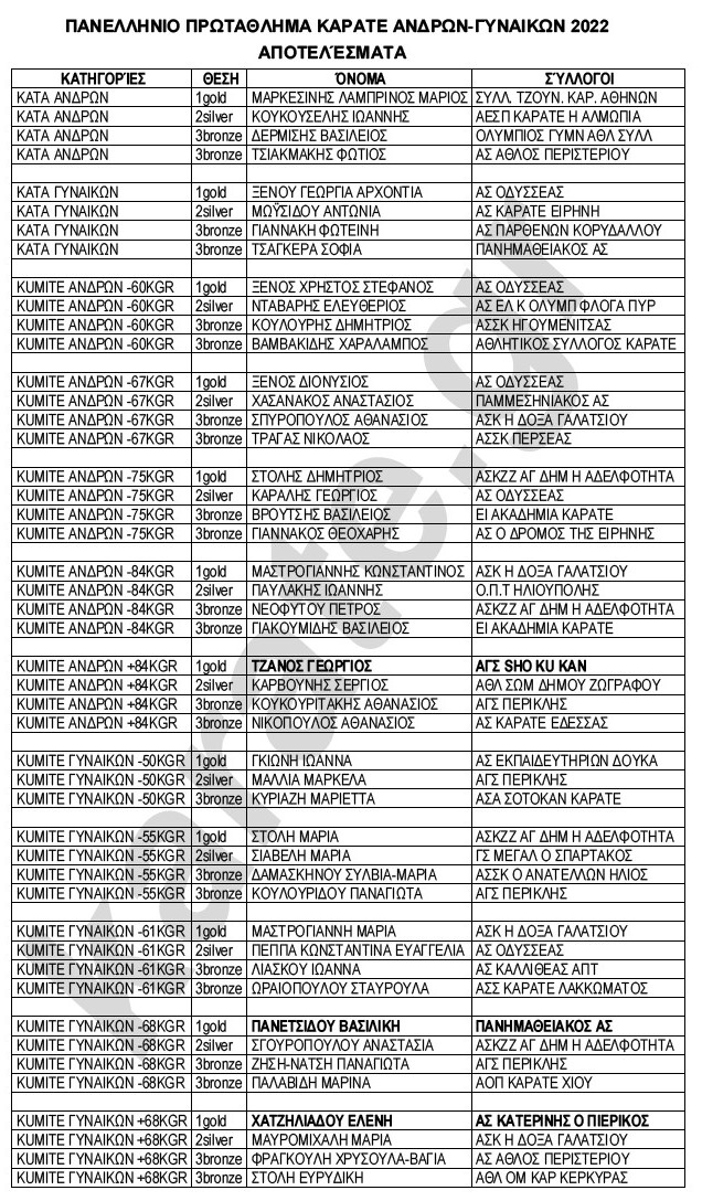 Σημειώνουμε εδώ ακόμα μια απάτη της ΕΛΟΚ: στα αποτελέσματα της Sportdata έγραφαν στη σειρά των μεταλλίων δεν έγραφαν μόνο τους μεταλλιούχους, αλλά σχεδόν όλους τους συμμετέχοντες, ώστε να ανεβάσουν ψυχολογικά αυτούς που έχασαν! Πολύ αισχρό και παιδαριώδες! Εμείς στον ανωτέρω πίνακα περιλάβαμε μόνο τους 3-4 πρώτους, που πήραν μετάλλια! Οι νικητές είναι νικητές και οι χαμένοι θα ξαναπροσπαθήσουν! Αυτό είναι το χαρακτηριστικό των αγώνων! Την παρηγοριά σας δεν την έχουν ανάγκη οι αθλητές! Την διοίκηση κοιτάξτε να διορθώσετε!