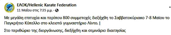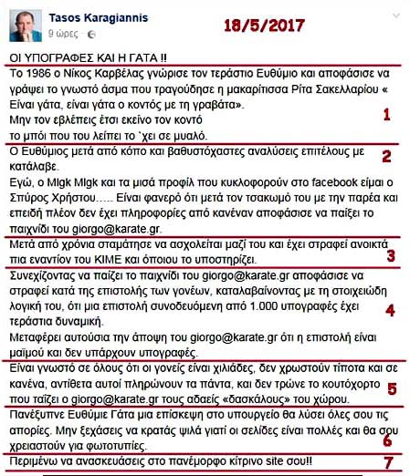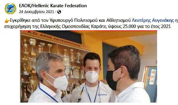 | 50 | Όταν το 2014 και κατά την εξέλιξη της Σχολής Προπονητών Καράτε "βομβάρδιζα" τα Υπουργεία με emails (κλικ εδώ) για τις παρανομίες του Γερόλυμπου σε τρεις αθλητικές ομοσπονδίες και την αδιαφορία της ΓΓΑ για αυτές τις παρανομίες (τα emails έφθαναν και στα χέρια του σημερινού Πρωθυπουργού!), η τότε κυβέρνηση του Αντώνη Σαμαρά έδωσε εντολή στον Υφυπουργό Αθλητισμού Γιάννη Ανδριανό να "καθαρίσει" τις ομοσπονδίες-μαϊμούδες με αποτέλεσμα μετά από ενδελεχείς έρευνες να αφαιρεθεί η ειδική αθλητική αναγνώριση από εννέα ομοσπονδίες (κλικ εδώ)! Αυτό δεν είχε γίνει ποτέ πριν και δεν έγινε ποτέ μετά, αλλά έγινε μόνο μια φορά στο τέλος του 2014 και αιτία ήταν οι έρευνες και δημοσιεύσεις του www.karate.gr! |