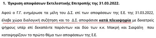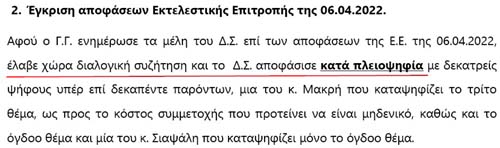 Στο Πρακτικό του ΔΣ (παράνομα χωρίς αριθμό) της 7/6/2021 (στη ΔΙΑΥΓΕΙΑ την 21/12/2021) το ΔΣ εκχώρησε αρμοδιότητες στην Εκτελεστική Επιτροπή, οι οποίες είναι οι επόμενες: