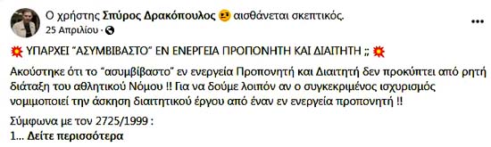 Στον λογαριασμό, λοιπόν, του Σπύρου Δρακόπουλου (25/4/2022) ανταλλάγησαν (δίνω ΕΠΙΛΕΚΤΙΚΑ τις ουσιωδέστερες) οι επόμενες απόψεις μεταξύ Δρακόπουλου και άλλων, τις οποίους θα δείτε μαζί με λίγα ένθετα τωρινά σχόλια δικά μου, ενώ οι προβαλλόμενες απόψεις αποτελούν αναμφίβολα μορφή "Αντιπολίτευσης"! Υπαρχει έντονη αμφισβήτηση για το συμβατό των ιδιοτήτων προπονητή και διαιτητή!