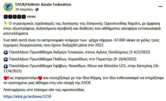 Από την άλλη μεριά η ΕΛΟΚ των ... "Ηνωμένων Νηπιαγωγίων" κομπάζει για τις 67.000 προβολές στιγμιότυπων από τους αγώνες που διοργανώνει με νήπια! Δεν κοιτάζει καλύτερα το ότι την εικοσαετία του 1980-2000 τα γυμναστήρια καράτε ήταν γεμάτα ενήλικους όλων των ηλικιών, ενώ σήμερα έχουν καταντήσει Νηπιαγωγία, που ... παρκάρουν οι γονείς τα μικρά παιδιά τους για να πάνε στο σούπερ μάρκετ!