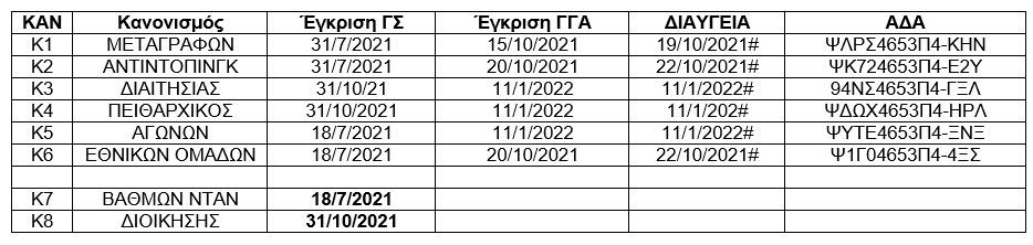 Η έλλειψη Εγκεκριμένου Κανονισμού από τη ΓΓΑ για την Απονομή Νταν αποδεικνύεται από την έλλειψη ανάρτησης τέτοιου κανονισμού στο site της ΕΛΟΚ με ημερομηνίες έγκρισης από τη ΓΓΑ (αφού υπεβλήθη μαζί με τους άλλους Κονονισμούς, αλλά ποτέ δεν εγκρίθηκε). Επίσης, ο εν λόγω αναρτημένος Κανονισμός φέρει τη διάκριση: "Εγκεκριμένο από την ΕΛ.Ο.Κ. - Γ.Σ. της 18 Ιουλίου 2021" και καμία ένδειξη ότι έχει εγκριθεί από τη ΓΓΑ! Δηλαδή οι ΑΠΑΤΕΩΝΕΣ "κεντάνε στην παρανομία"!!! Συνεπώς, η έλλειψη ανάρτησης στη ΔΙΑΥΓΕΙΑ και ΑΔΑ, όπως φαίνεται από τον επόμενο πίνακα με τους Κονονισμούς της ΕΛΟΚ, όπως αναρτώνται στο site της και ...