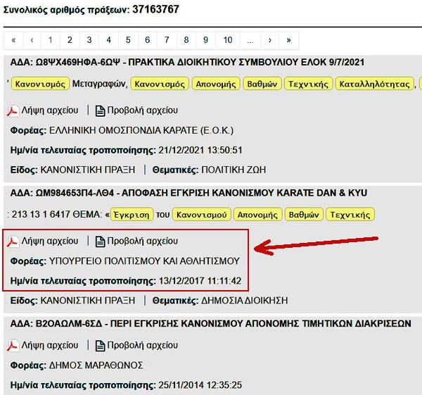 ... και ταυτόχρονα, όπως αποδεικνύεται από την αναζήτηση στη ΔΙΑΥΓΕΙΑ κατωτέρω, όπου ο τελευταίος Κανονισμός Απονομής Νταν είναι εκείνος με την υπογραφή του ηλίθιου Γενικού Γραμματέα Αθλητισμού Ιούλιου Συναδινού, που υπέγραψε την 13/12/2017: