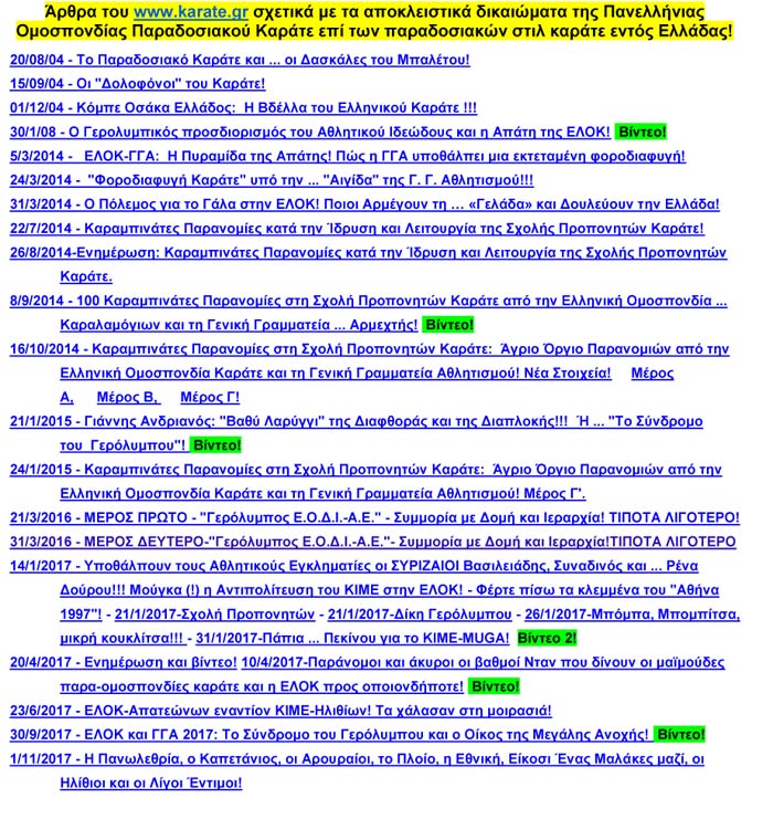Πυραμίδες Νταν με ... Τούβλα! Οι Shihan του Shitoryu! Ανασυντάσσεται το Shotokan! Οι Συμμορίες χειραγώγησης της ΕΛΟΚ! Επιτροπές και Πειθαρχικό. Σχολή Προπονητών και Παρανομίες ΕΛΟΚ!
