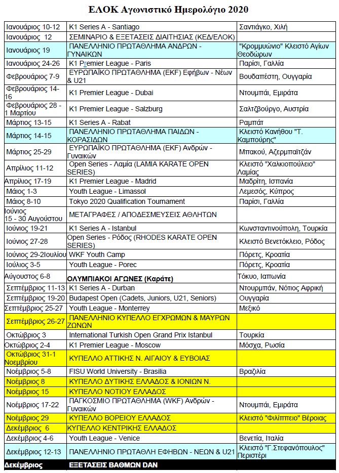 Τα ίδια ισχύουν και για το καλενδάρι του 2020! Οι σειρές με άσπρο αφορούν σε διεθνείς αγώνες ή μεταγραφές ή συνελεύσεις, οι σειρές με πράσινο είναι οι απαραίτητοι θεσμικοί αγώνες της ΕΛΟΚ, οι έξι σειρές με κίτρινο Εγχρώμων και Μαύρων Ζωνών ή OPEN SERIES επί το ... κοσμικότερον (!) αφορούν σε αγώνες-απάτες της ΕΛΟΚ λόγω της μηδενικής αξίας τους και τέλος η κάτω σειρά αποτελεί ένα ακόμα ... "Do it yourself" της ΕΛΟΚ!
