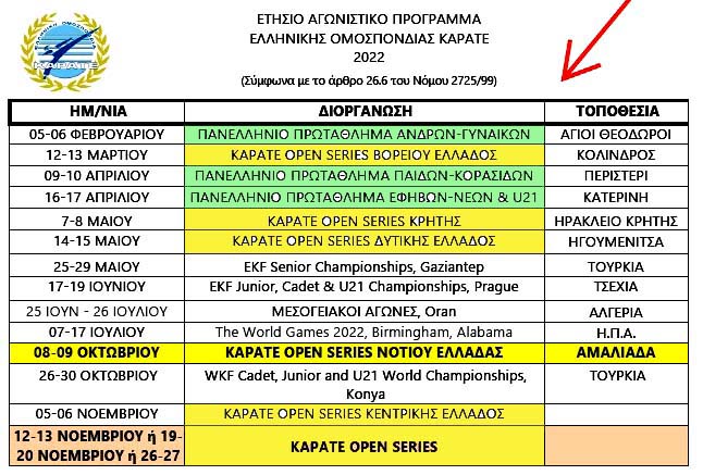 Τα ίδια ισχύουν και για το φετεινό καλενδάρι του 2022! Οι σειρές με άσπρο αφορούν σε διεθνείς αγώνες, οι σειρές με πράσινο είναι οι απαραίτητοι θεσμικοί αγώνες της ΕΛΟΚ και οι έξι σειρές με κίτρινο Εγχρώμων και Μαύρων Ζωνών ή OPEN SERIES επί το ... κοσμικότερον (!) αφορούν σε αγώνες-απάτες της ΕΛΟΚ λόγω της μηδενικής αξίας τους! Εδώ παρατηρούμε ότι πάλι δεν βλέπουμε εξετάσεις για Νταν/ΕΛΟΚ (άλλη απάτη αυτή!) και ούτε θα δείτε, αφού πλέον τα Νταν/ΕΛΟΚ ΤΑ ΠΟΥΛΑΝΕ ΚΑΤΕΥΘΕΙΑΝ ΧΩΡΙΣ ΕΞΕΤΑΣΕΙΣ ΟΙ ΑΠΑΤΕΩΝΕΣ ΤΗΣ ΕΚΤΕΛΕΣΤΙΚΗΣ ΕΠΙΤΡΟΠΗΣ καταστρέφοντας κάθε έννοια τεχνικής αξιολόγησης στο καράτε!!!