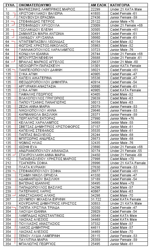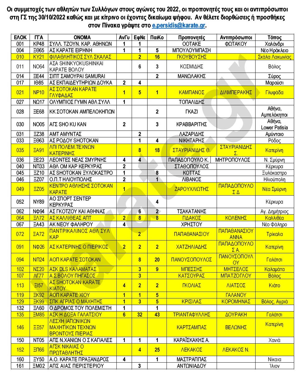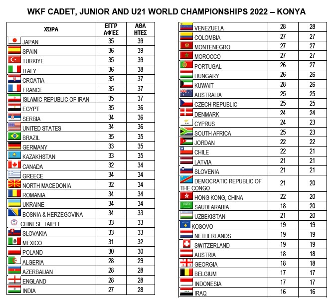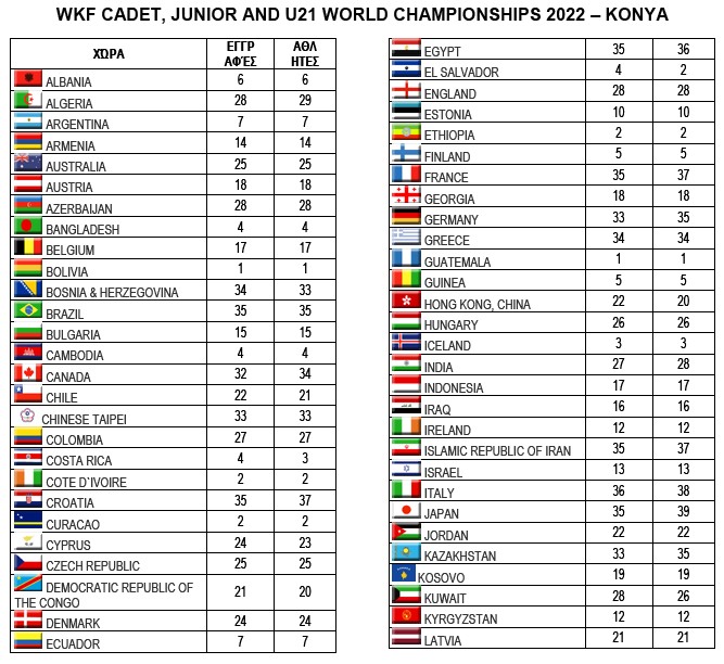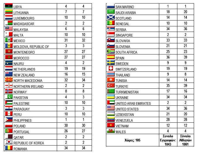 29/10/2022 - Οι συμμετοχές σε αθλητές κατά αλφαβητική σειρά των χωρών!