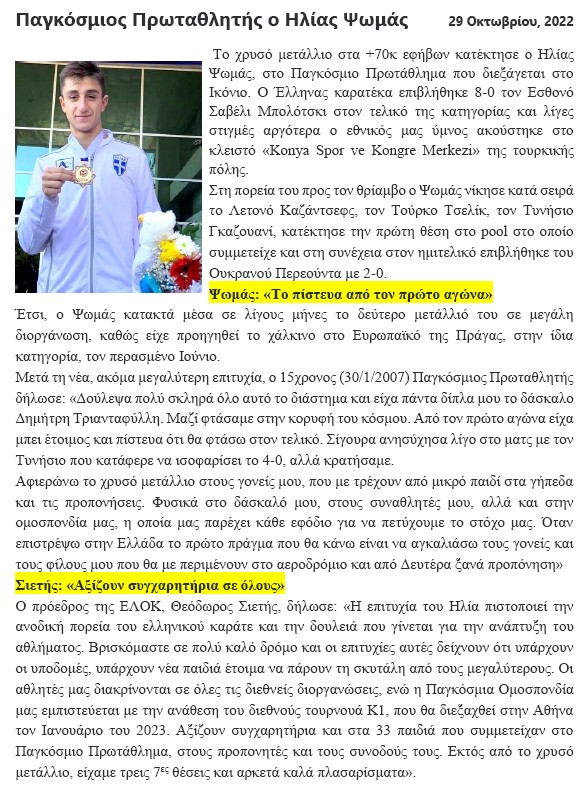 Την 29/10/2022 προηγήθηκε ο πανηγυρισμός για το χρυσό μετάλλιο του Ηλία Ψωμά στην κατηγορία των +70 κιλών Εφήβων.