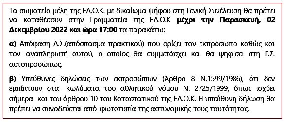 Με απόφαση του ΔΣ της 9/11/2022 καλούνται οι σύλλογοι της ΕΛΟΚ σε γενική συνέλευση την 11/12/2022 για να "επικαιροποιήσουν" τους επόμενους κανονισμούς: