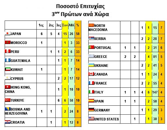 Βλέπουμε, λοιπόν, ότι η Ιαπωνία έχει ένα Ποσοστό Επιτυχίας (απόδοσης της εθνικής τους ομάδας) = 15/26 = 58%!!! Το Μαρόκο = 33%, το Περού = 33%, κτλ., η Τουρκία = 10%, η Βόρεια Μακεδονία = 7%, η Ελλάδα = 4/81 = 5%, κτλ., η Γαλλία = 4%, η Ιταλία = 4%, η Αμερική = 3%!