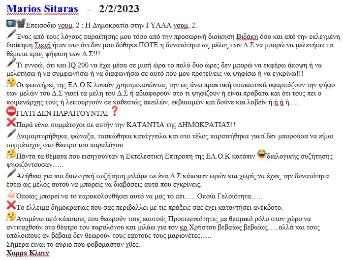 Η ανωτέρω επιστολή της Εξελ. Επιτρ. σχολιάζεται ως κατωτέρω στο λογαριασμό του Μάριου Σιταρά στο FB!