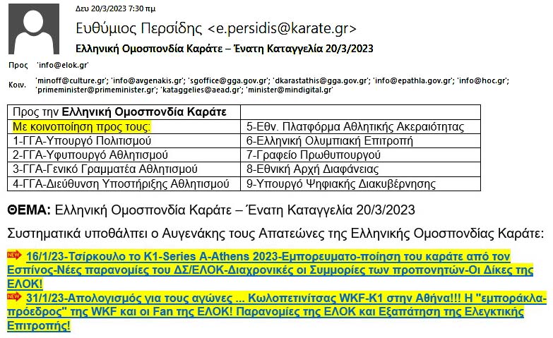 Από την 1/3/2023 καταγγέλλονται αναδρομικά από την 29/5/2021 όλες οι παρανομίες του Διοικητικού Συμβουλίου της ΕΛΟΚ σε όλες τις αρμόδιες υπηρεσίες με emails!