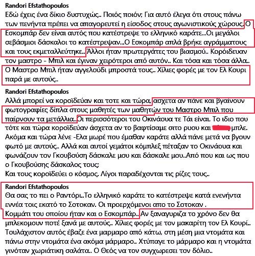 Η εν λόγω καταγγελία πραγματοποιήθηκε στο πλαίσιο της υπεράσπισης της τιμής και της υπόληψης της δικής μου, της Οικογένειας μου, της Εταιρίας της συζύγου μου από φήμες και υπόνοιες που διαδίδονται με σκοπό τους να μας σπιλώσουν και να μας διαβάλλουν αλλά και να διαφυλαχθεί και να προστατευτεί η ακεραιότητα του αθλήματος του Καράτε από κακόβουλες ενέργειες.