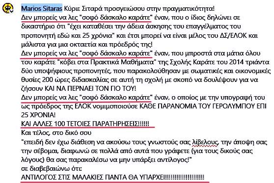 Και πραγματικά, μόλις την διάβασε ο Δημοκρατικός κύριος Μάριος Σιταράς, την διέγραψε αμέσως! Πού είναι η Δημοκρατία, για το έλλειμμα της οποίας εντός της ΕΛΟΚ διαμαρτύρεται ο Μάριος Σιταράς? Το διαδίκτυο είναι πεδίο ελεύθερης συζήτησης υπό τους κανόνες της ευπρέπειας και όχι του σκοταδισμού! Εγώ περίγραψα πραγματικά γεγονότα, που ισχύουν και είναι γνωστά σε όλο τον κόσμο του καράτε! Το Facebook δίνει την ευχέρεια να σβήνει ο διαχειριστής του λογαριασμού κάθε σχόλιο, που δεν του αρέσει, βγάζοντας στην επιφάνεια τον ΦΑΣΙΣΤΑ, που έχουν μερικοί μέσα τους! Ο "Φασίστας" με μουτσούνα "Δημοκράτη" είναι κάτι πολύ σύνηθες και όχι μόνο τις Απόκριες κύριε Σιταρά και το βγάζεις πολύ εύκολα και πολύ συχνά!