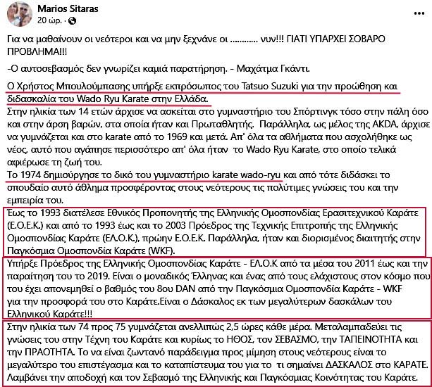 ... βλέπουμε ότι ο Μάριος Σιταράς, ενώ εύστοχα διαπιστώνει διοικητικές και οικονομικές ατασθαλίες στη διοίκηση της ΕΛΟΚ, παράλληλα βλέπει τον Μπουλούμπαση σαν "είδωλο δασκάλου του καράτε"! Ο Σιταράς ξεχνάει ότι όσο ο Μπουλούμπασης ήταν δάσκαλός του, άλλο τόσο ήταν και ΠΑΡΑΝΟΜΟ ΜΕΛΟΣ του ΔΣ αρχικά και πρόεδρος της ΕΛΟΚ αργότερα! Όσο ήταν πρόεδρος της ΕΛΟΚ, άλλο τόσο ήταν και έμμισθος προπονητής στο σύλλογό του στο Νέο Ηράκλειο ΠΑΡΑΝΟΜΑ! Γι' αυτό είχε πρόεδρο τη γυναίκα του στο σύλλογό του και ο ίδιος δεν ήταν μέλος του ΔΣ του συλλόγου του! Όσο ήταν έμμισθος προπονητής στο σύλλογό του ήταν ταυτόχρονα και μέλος του ΔΣ/ΕΛΟΚ ΠΑΡΑΝΟΜΑ! Και αυτό, διότι ποτέ δεν ακούστηκε να έχει κάνει άλλο επάγγελμα από το οποίο να πήρε ένσημα από το 2000 και μετά ώστε να πάρει τη σύνταξη που παίρνει σήμερα!!!