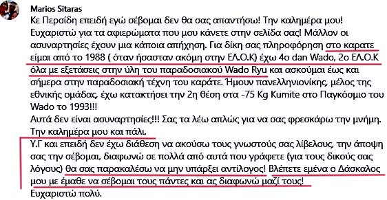Εδώ να διευκρινίσω στον κ. Μάριο Σιταρά ότι: Πρώτον, διακόπτει μονομερώς τη συζήτηση επειδή δεν τον συμφέρει, κοινώς ... "φασιστίζει"! Δεύτερον, το τέταρτο Νταν Wado (να δούμε τα τέσσερα διπλώματα?), που έχει είναι για τα σκουπίδια, αφού αυτός/αυτοί που του το έδωσαν δεν υπάρχουν σήμερα, ενώ εφόσον δεν είναι μέλος της ΠΟΠΚ δεν ασκείται στο παραδοσιακό καράτε, αλλά σε κάτι, που δεν έχει ούτε αυτός καταλάβει τι είναι! Τρίτον, μην χρησιμοποιείς το "σέβομαι" για να κλείσει η συζήτηση! Η πραγματικότητα είναι ότι δεν σέβεσαι την αλήθεια, μας λες αρλούμπες, ενώ ο ίδιος ζεις με τις φαντασιώσεις σου και όχι στον πραγματικό κόσμο!