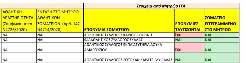 Ο εν λόγω Πίνακας έχει σε οριζόντια γραμμή τις δύο επόμενες εικόνες για τις τρεις πρώτες εγγραφές: Φαίνονται χωριστά οι στήλες της ΕΛΟΚ και της ΓΓΑ! Τόσο βλήματα είναι και οι ΔΥΟ, ώστε επί ενάμιση χρόνο τώρα δεν έχουν καταφέρει να συμφωνήσουν στα ονόματα των συλλόγων, ώστε να μην τα γράφουν δύο φορές και να σημειώνουν στην ιδιαίτερη στήλη αν ΤΑΥΤΙΖΟΝΤΑΙ ή ΟΧΙ! Δύο στήλες άχρηστες, οπότε και η τρίτη της ΓΓΑ με τα ΝΑΙ στο Μητρώο θα ήταν και αυτή άχρηστη!
