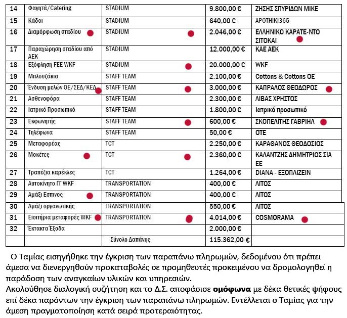 Στο 16 βλέπουμε την Διαμόρφωση Σταδίου από την εταιρεία του Γιάννη Μοσχόβα και της Μάμι Ούτο (δύο μόνο ατόμων), που ιδρύθηκε για προπονήσεις, σεμινάρια και εξετάσεις καράτε να αναλαμβάνει τώρα και στρώσιμο στρωμάτων σε αγώνες, ενώ συγχρόνως ο Γιάννης Μοσχόβας είναι ταυτόχρονα και προπονητής συλλόγου της ΕΛΟΚ και διαιτητής της ΕΛΟΚ!!! Πώς μπορεί να γίνεται αυτό? Ποιό προσωπικό έβαλε ο Μοσχόβας να στρώσει τα στρώματα έξι αγωνιστικών χώρων, πώς πληρώθηκε η εταιρεία, πώς πληρώθηκε το προσωπικό, πώς πληρώθηκαν τα ασφαλιστικά του προσωπικού! Μιλάμε για καραμπινάτες παρανομίες!!! Επ' αυτού δώσαμε μερικά στοιχεία και στο προηγούμενο άρθρο μας με κλικ εδώ!
