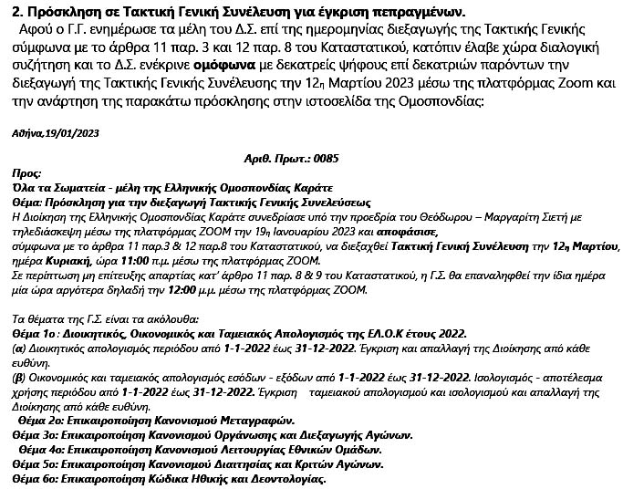 Στο δεύτερο Θέμα η Πρόσκληση για τη Γενική Απολογιστική Συνέλευση χωρίς Απολογισμό και χωρίς την Έκθεση της Ελεγκτικής Επιττροπής, την οποία εξαπατούν, όπως εξαπατούν και τους συλλόγους! Χωρίς Απολογισμό και Έκθεση πώς θα συζητήσουν οι σύλλογοι στα δικά τους ΔΣ τις εξελίξεις και πώς θα ψηφίσουν στη ΓΣ/ΕΛΟΚ? Είμαι περίεργος, αυτοί οι δυό ηλίθιοι Μεσανυχτάκης και Μαυρωτάς ΔΕΝ βλέπουν την καραμπινάτη χειραγώγηση της ομοσπονδίας από την Εκτελεστική της Επιτροπή! Με τι θράσος μιλάνε για Σύμβαση Macolin και Επιτροπή για καταπολέμηση της χειραγώγησης των αγώνων Ε.Π.ΑΘΛ.Α., όταν υποθάλπουν ομοσπονδίες, οι οποίες εξόφθαλμα χειραγωγούνται από συμμορίες των ΔΣ τους? Αυτός ο Δημήτρης Καραστάθης, που παρακολουθεί την ΕΛΟΚ και διαβάζει το karate.gr δεν τους λέει τίποτα???