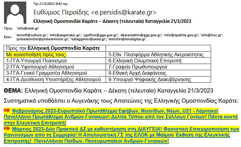 Από την 1/3/2023 καταγγέλλονται αναδρομικά από την 29/5/2021 όλες οι παρανομίες του Διοικητικού Συμβουλίου της ΕΛΟΚ σε όλες τις αρμόδιες υπηρεσίες με emails!