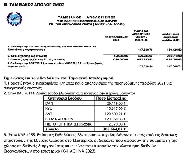 Όπως γίνεται φανερό εκ των ανωτέρω, στις 399.000 € των εσόδων της ΕΟΔΙ-ΞΕ.ΒΡΩ.ΧΡΗ. για το 2022, το άθροισμα των παράνομων εισπράξεών της είναι 30.000 + 16.000 + 50.000 + 11.000 + 71.000 + 70.000 = 248.000 € και αποτελούν οικονομικές απάτες του επόμενου ΔΣ/ΕΛΟΚ και η ΕΛΟΚ εισπράττει χρήματα με καραμπινάτες ψευδείς αιτιολογίες στα παραστατικά της: