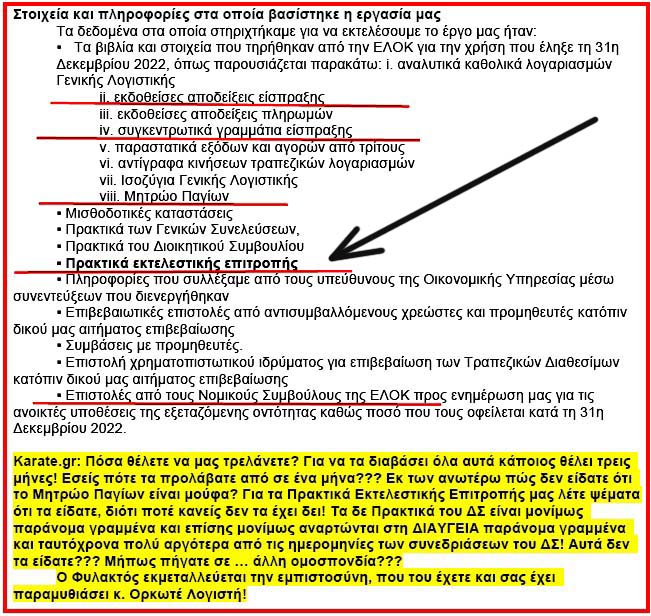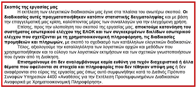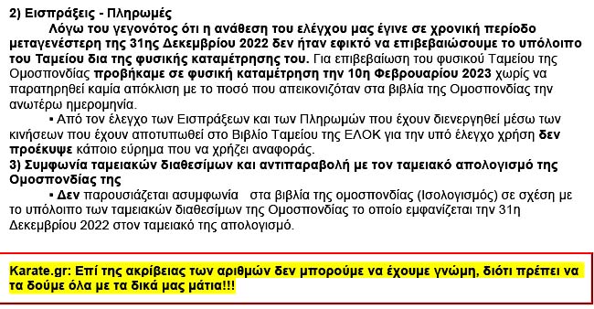 Εδώ σαφέστατα, ο Ορκωτός, αποποιείται της ευθύνης των οικονομικών καταστάσεων, πράγμα που καθιστά την Έκθεσή του τελείως άχρηστη για την επικύρωσή της από τη Γενική Συνέλευση και την απαλλαγή του ΔΣ από πάσης ευθύνης!!! Συνεπώς, ο Διαχειριστικός και Οικονομικός Έλεγχος της ΕΛΟΚ παραμένει αίολος, απόλυτα αστήρικτος και αθεμελίωτος!