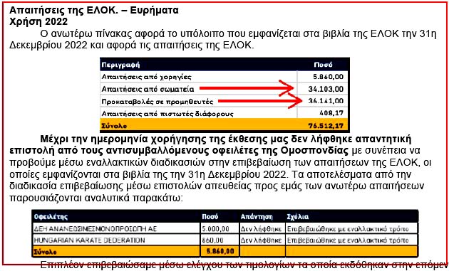 Απαιτήσεις από σωματεία: Αυτό που ενδιαφέρει είναι πόσοι και ποιοί σύλλογοι οφείλουν ετήσιες συνδρομές και ποιές! Και αυτό θα πρέπει να δημοσιεύεται, ενώ θα έπρεπε να διατηρείται σε ειδικό βιβλίο από το κάθε ΔΣ της ΕΛΟΚ ένας ΒΕΒΑΙΟΣ ΚΑΙ ΔΙΑΦΑΝΗΣ λεπτομερής πίνακας πληρωμών των ετήσιων συνδρομών, ώστε να ελέγχεται το δικαίωμα ψήφου στις Γενικές Συνελεύσεις, διότι αυτό είναι ένα διαχρονικό σημείο καραμπινάτης νοθείας του εκλογικού σώματος!!!