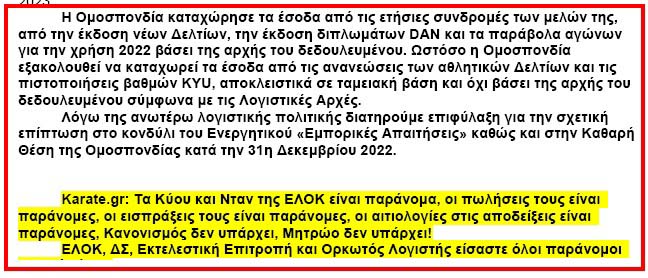 1.4 - Οι εξετάσεις Νταν των 30.000 € αποτελούν καραμπινάτη παρανομία της ΕΛΟΚ, διότι κατά ΠΡΩΤΟΝ με αυτές και μόνο έχει εκτραπεί από το Σκοπό της και θα πρέπει να της αφαιρεθεί η Ειδική Αθλητική Αναγνώριση, διότι εξαπατούν τον κόσμο εκδίδοντας Νταν σε κωλόχαρτα μόνο για να εισπράττουν! Κατά ΔΕΥΤΕΡΟΝ έχουμε και δεύτερη καραμπινάτη παρανομία, διότι εξετάσεις και αποτελέσματα πρέπει να γίνονται μετά από τις αντίστοιχες αποφάσεις του ΔΣ πράγμα που δεν γίνεται ΠΟΤΕ! Κατά ΤΡΙΤΟΝ, τα διπλώματα είναι απόλυτα προσωπικά και θα πρέπει να κόβονται αποδείξεις στο όνομα του κάθε εξεταζόμενου και νέου κατόχου Νταν! Πώς εισπράττει τα λεφτά ο Μαφιόζος Ταμίας Θανάσης Φυλακτός??? Το πιθανότερο κατά ΤΕΤΑΡΤΟΝ είναι να τα εισπράττει με αποδείξεις στο όνομα συλλόγων και όχι ατόμων και με αιτιολογικό "οικονομική ενίσχυση για τους σκοπούς της ομοσπονδίας", πράγμα που σημαίνει ότι πάει σούμπιτος ΚΟΡΥΔΑΛΛΟ!!!