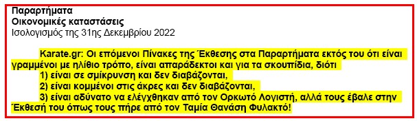 Οι επόμενες οικονομικές καταστάσεις της Έκθεσης (με κλικ εδώ) δεν διαβάζονται τυπωμένες σε χαρτί Α4, δεν έχουν συνταχθεί από τον Ορκωτό, αλλά έχουν μπει τσόντα από τον Φυλακτό στην Έκθεση του Ορκωτού και μάλιστα ούτε από τον Φυλακτό, αλλά από ... κάποιον περαστικό στο δρόμο γιατί είναι και κομμένες στις άκρες!!!