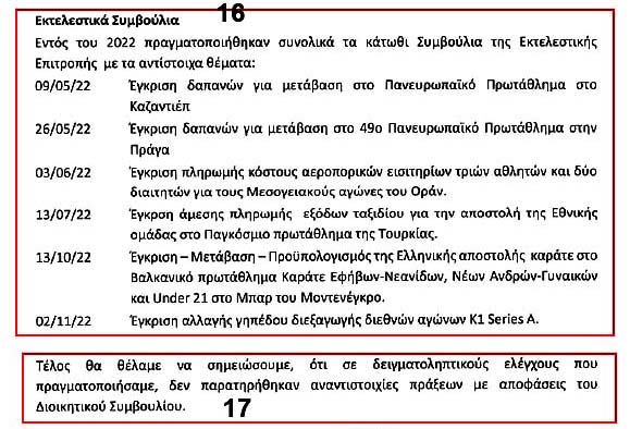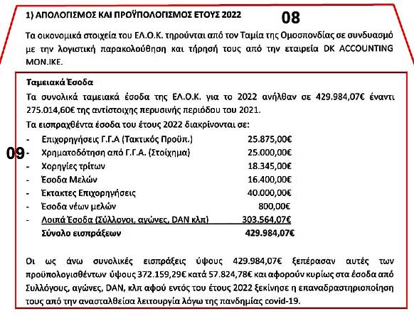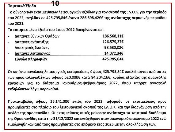 Όπως γίνεται φανερό εκ των ανωτέρω, στις 399.000 € των εσόδων της ΕΟΔΙ-ΞΕ.ΒΡΩ.ΧΡΗ. για το 2022, το άθροισμα των παράνομων εισπράξεών της είναι 30.000 + 16.000 + 50.000 + 11.000 + 71.000 + 70.000 = 248.000 € και αποτελούν οικονομικές απάτες του επόμενου ΔΣ/ΕΛΟΚ και η ΕΛΟΚ εισπράττει χρήματα με καραμπινάτες ψευδείς αιτιολογίες στα παραστατικά της: