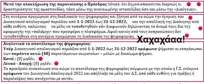 Για να μη μακρυγορούμε, με τον ίδιο τρόπο έγιναν και οι υπόλοιπες ψηφοφορίες με άμεσο αποτέλεσμα η Γενική Συνέλευση να είναι ΑΚΥΡΗ!!!