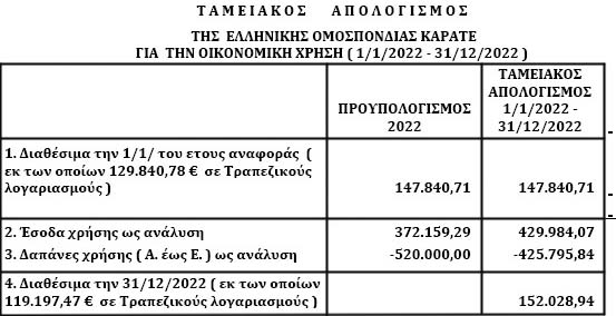 "Αφού ο Ταμίας της Ομοσπονδίας απάντησε σε ερωτήσεις αντιπροσώπων, ο Πρόεδρος της Γ.Σ. ζήτησε από το σώμα την έγκριση του ταμειακού απολογισμού, ισολογισμού- αποτέλεσμα χρήσης από 1-1-2022 έως 31-12-2022, και την απαλλαγή της Διοίκησης και των Ελεγκτών από κάθε ευθύνη για πράξεις ή παραλείψεις που συνέχονται με τον οικονομικό και ταμειακό απολογισμό εσόδων – εξόδων, καλώντας τα μέλη να τοποθετηθούν εάν διαφωνούν δηλώνοντας το όνομά τους δια της εφαρμογής της «παλάμης» που προσφέρει η πλατφόρμα. Αφού κανείς από τους εκπροσώπους δεν τοποθετήθηκε στη συνέχεια προχώρησε τη διαδικασία της ψηφοφορίας."