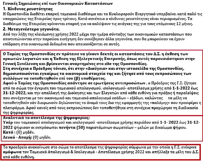 Απαράδεκτες οι Εκθέσεις με διαστρεβλωμένα στοιχεία του Ταμία Θανάση Φυλακτού, του Ορκωτού Λογιστή Γιώργου Νίκου και των δύο από τα τρία μέλη της Ελεγκτικής Επιτροπής Πέτρου Σταυροπιερράκου και Μάνου Ιπποκράτη! ΆΚΥΡΗ η απαλλαγή του ΔΣ από πάσης ευθύνης!!!