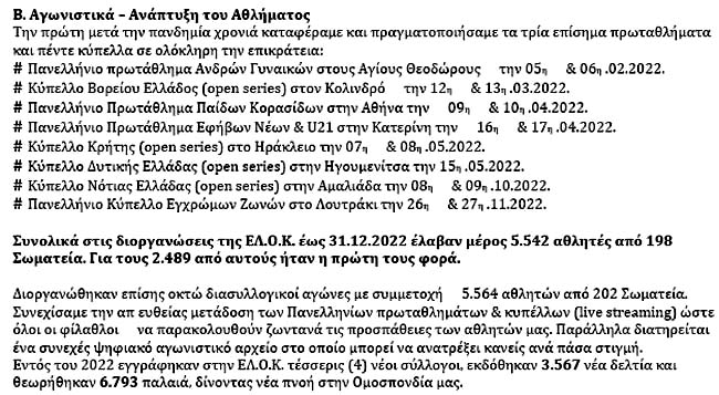 Από το (Β) στην Ανάπτυξη του Αθλήματος του Κώστα Μητρόπουλου έχουμε ότι: εκδόθηκαν 3.567 νέα δελτία αθλητών και θεωρήθηκαν 6.793 παλαιά δελτία αθλητών!