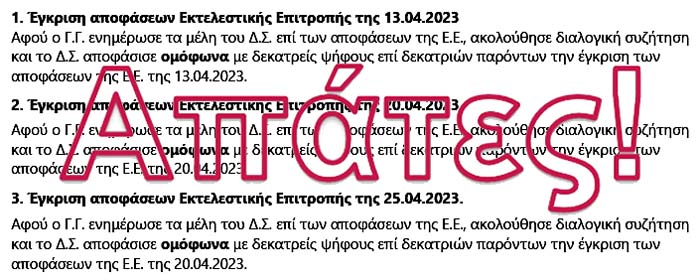 ... και αυτό ΜΕΡΙΚΩΣ βέβαια, διότι συνεχίζουν πάντα την εγκληματική τους συμπεριφορά της ... απόκρυψης των αποφάσεων και των πράξεών τους με την ΑΠΑΤΗ της Εκτελεστικής Επιτροπής, τις αποφάσεις της οποίας εγκρίνει πάντα το ΔΣ χωρίς αυτές να αναφέρονται πουθενά!!!