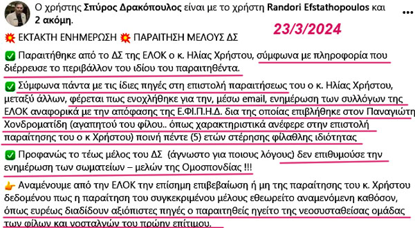 5. Το 2024 κίνησε επαναφορά καταγγελίας στην ΕΦΙΠΗΔ την οποία είχε πραγματοποιήσει το 2021, ο νομικός σύμβουλος της ΕΛΟΚ σήμερα, η οποία ήταν στα «συρτάρια της ΕΦΙΠΗΔ» προκειμένου να τιμωρηθεί ο κ. Χονδροματίδης (δάσκαλος) και ένας πρόεδρος συλλόγου…Οπως και τιμωρήθηκε μετά την αδράνεια που επέδειξε η ΕΦΙΠΗΔ από το 2021 έως και σήμερα με 5 χρόνια ο πρώτος και 16 μήνες ο δεύτερος (πως να το κρίνουμε αυτό…ειλικρινά δεν ξέρω). Διότι ο κ. Χονδροματίδης εξέφρασε την πρόθεση του να ασκήσει αντιπολίτευση και να κατέβει στις εκλογές απέναντι στην διοίκηση Σιετή!