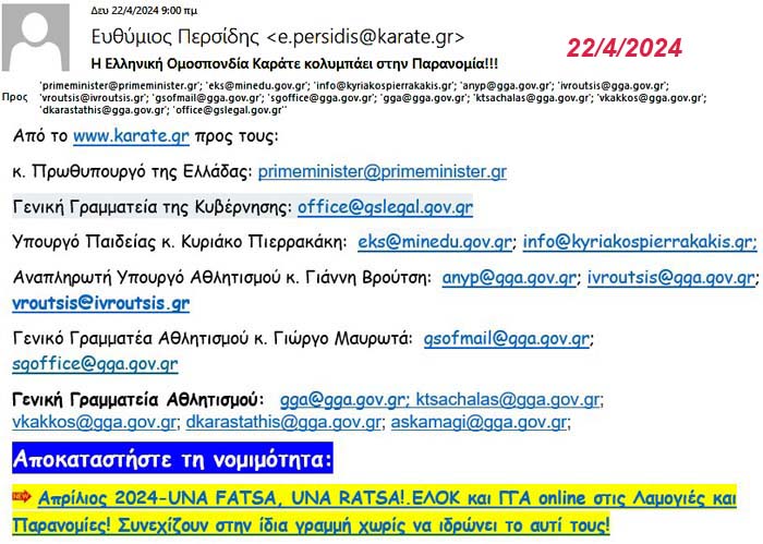Από την 1/3/2023 καταγγέλθηκαν αναδρομικά από την 29/5/2021 όλες οι παρανομίες του Διοικητικού Συμβουλίου της ΕΛΟΚ σε όλες τις αρμόδιες υπηρεσίες με emails, ώστε να μην λένε ότι δεν ξέρουν!