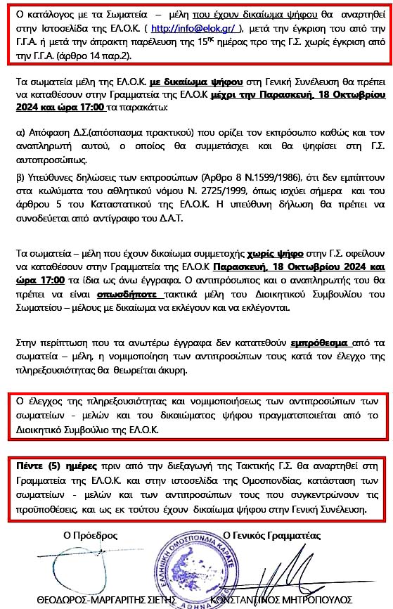 4 - Ο Κατάλογος των σωματείων με δικαίωμα ψήφου θα αναρτηθεί πέντε ημέρες πριν από τη ΓΣ στο site της ΕΛΟΚ! Αλλά για τον Κατάλογο αυτόν ελέγχουν α) η ΕΛΟΚ (δηλαδή ο Μητρόπουλος!) τους αθλητές στους αγώνες της των σωματείων, και β) η ΓΓΑ (δηλαδή ο Καραστάθης!) τις προϋποθέσεις νομιμότητας των σωματείων! Συνεπώς ο Κατάλογος διαμορφώνεται εν αγνοία των σωματείων από δύο Μαφιόζους της; ίδιας Συμμορίας!!!